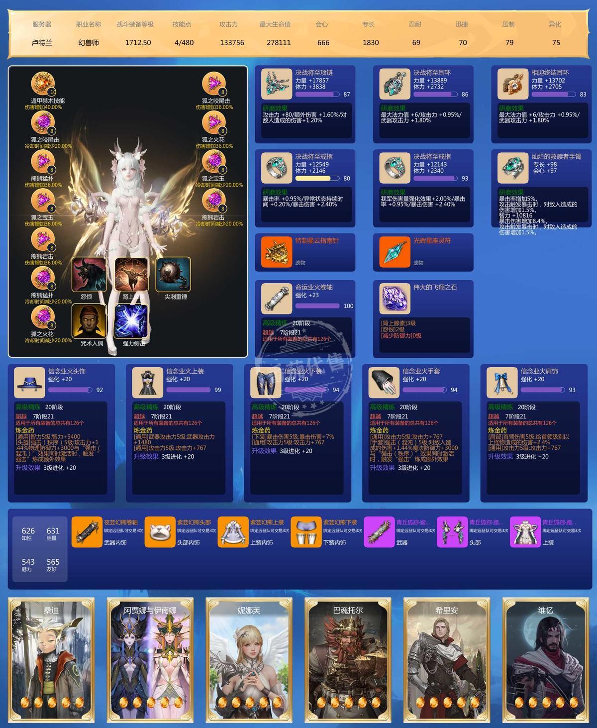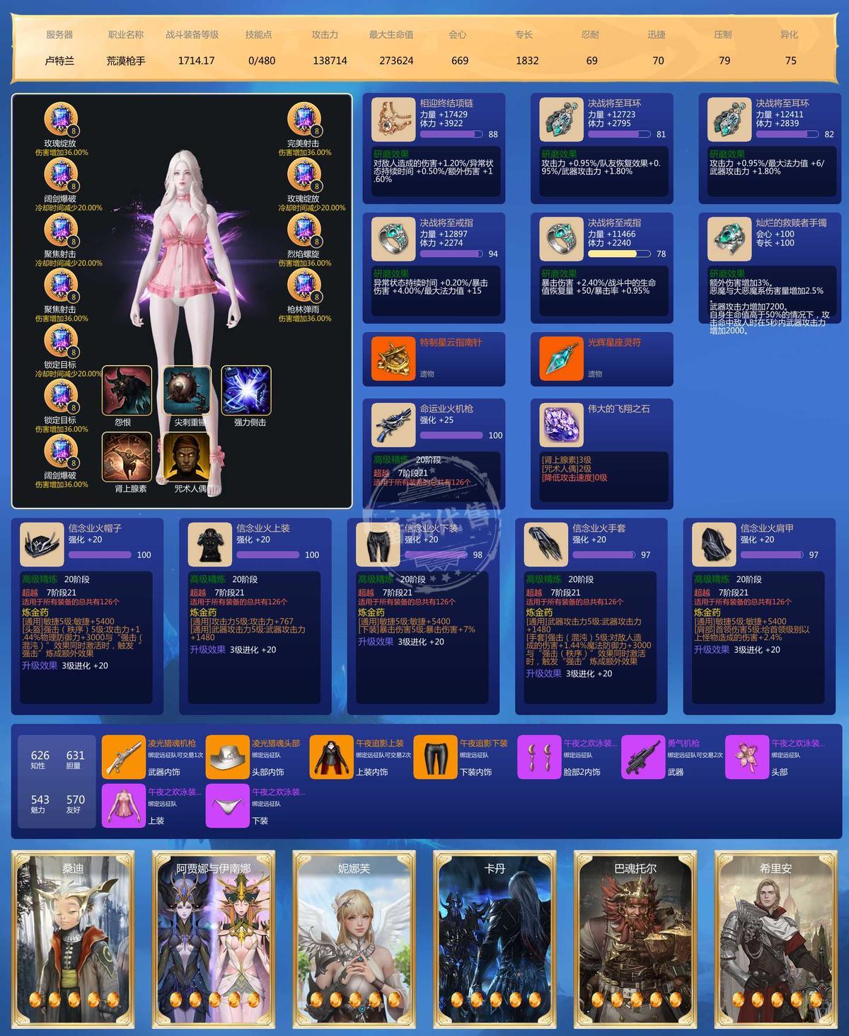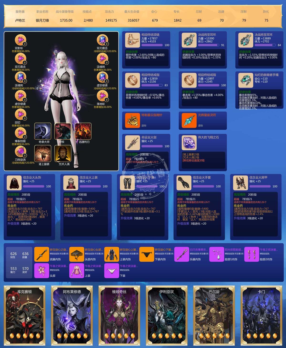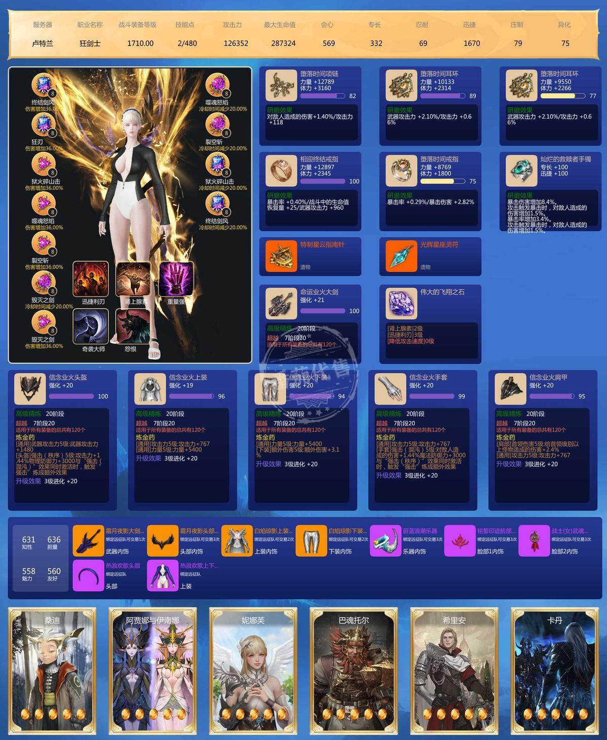 7连,武器全部满品,3个全身满品,4把25,1把23武器,7个97毕业石头。车头刀锋1735,战斗力2300,7套多10级宝石,遗物书都吃满了,仓库里还囤了下个版本的遗物书。首饰都配好了,手镯都是双攻双金。身上有双金,单金首饰都包含在价格里面了,天空也都送了。别拿市面上那些光有25武器的号来对比,这种细节全网就这一个。