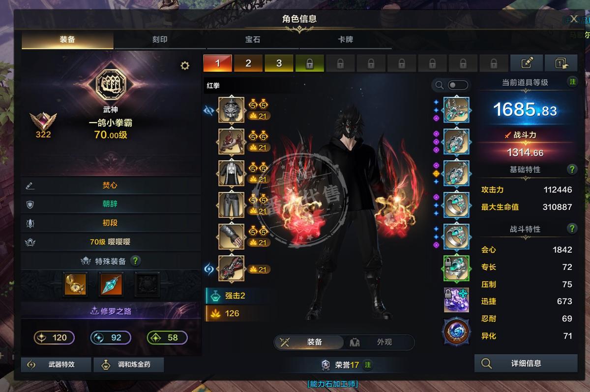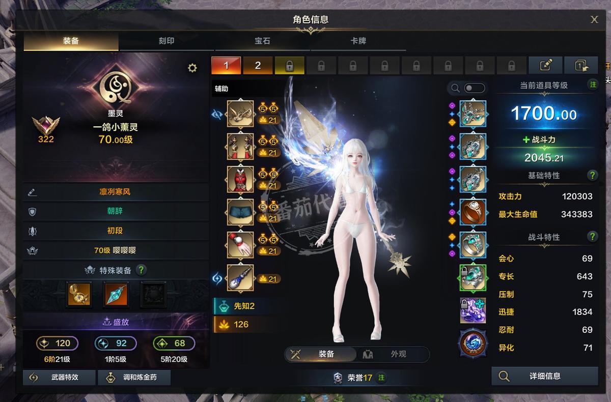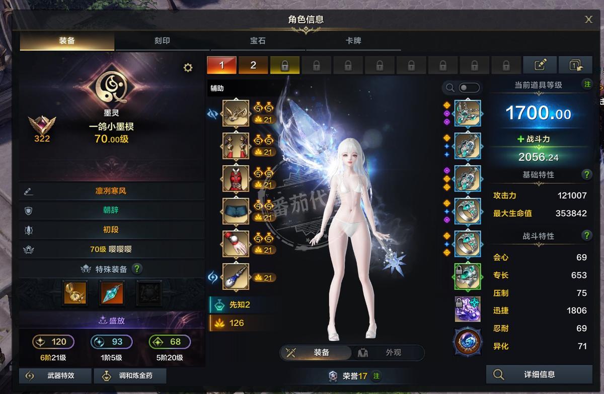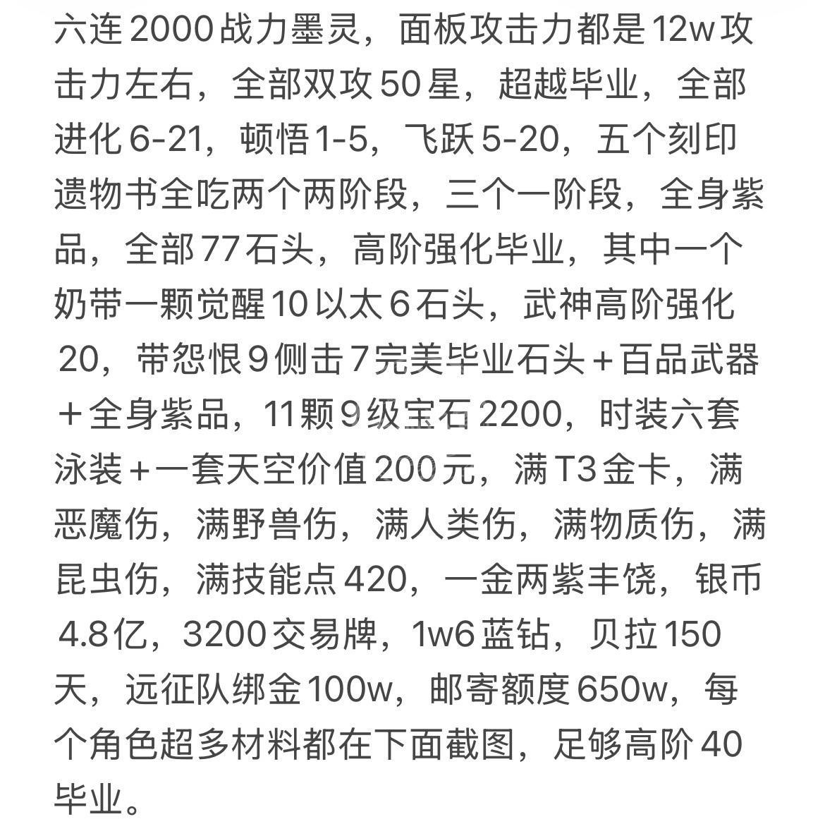 商品描述: 六连2000战力墨灵,面板攻击力都是12w攻击力左右,全部双攻50星,超越毕业,全部进化6-21,顿悟1-5,飞跃5-20,五个刻印遗物书全吃两个两阶段,三个一阶段,全身紫品,全部77石头,高阶强化毕业,其中一个奶带一颗觉醒10以太6石头,武神高阶强化20,带怨恨9侧击7完美毕业石头+百品武器+全身紫品,11颗9级宝石2200,时装六套泳装+一套天空价值200元,满T3金卡,满恶魔伤,满野兽伤,满人类伤,满物质伤,满昆虫伤,满技能点420,一金两紫丰饶,银币4.8亿,3200交易牌,1w6蓝钻,贝拉150天,远征队绑金100w,邮寄额度650w,每个角色超多材料都在下面截图,足够高阶40毕业。