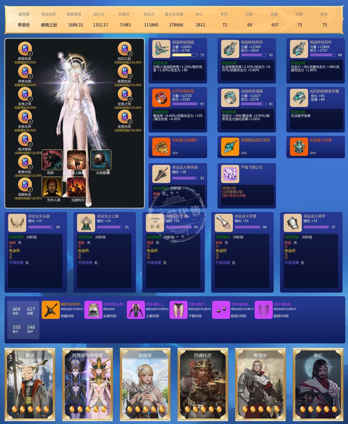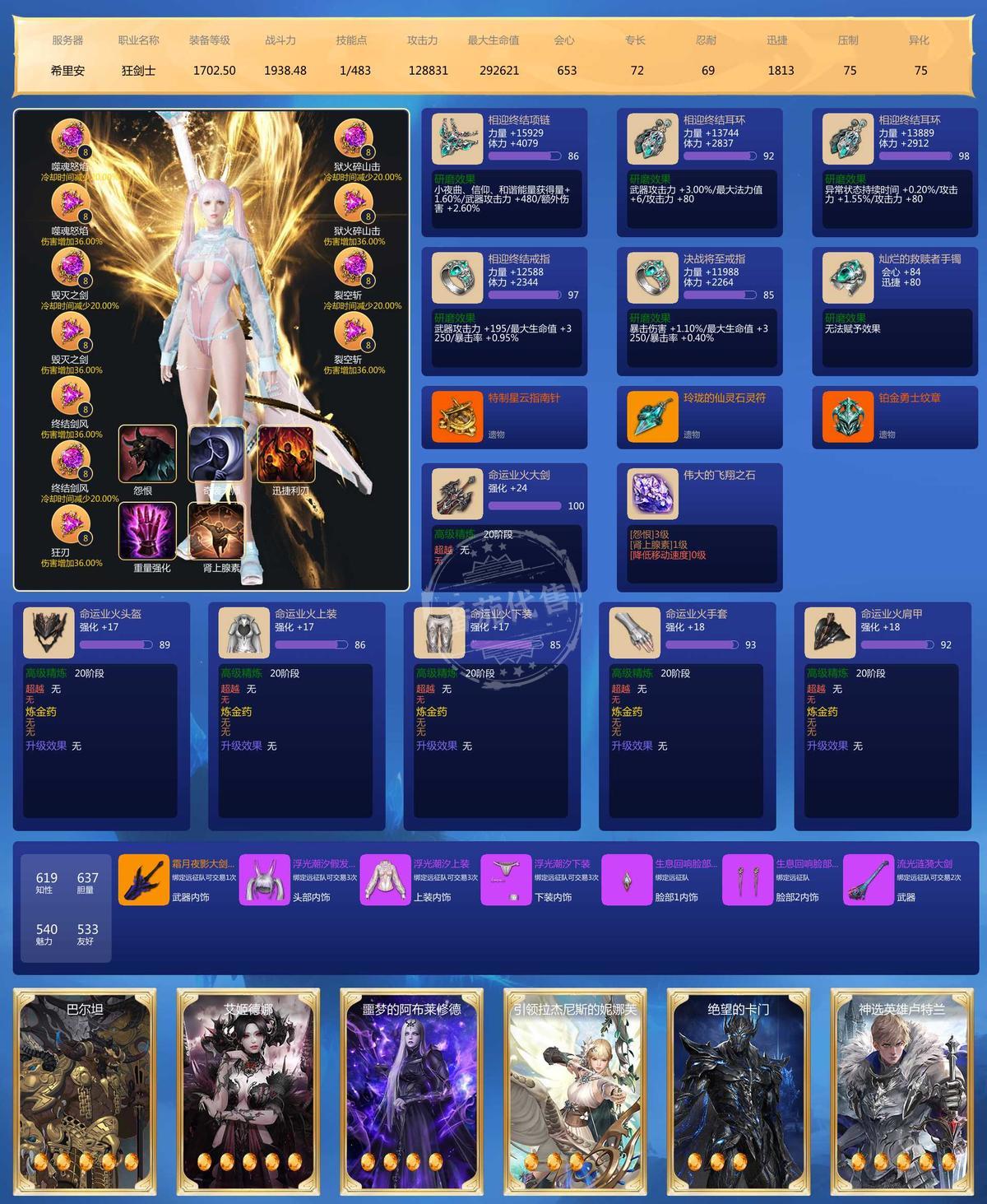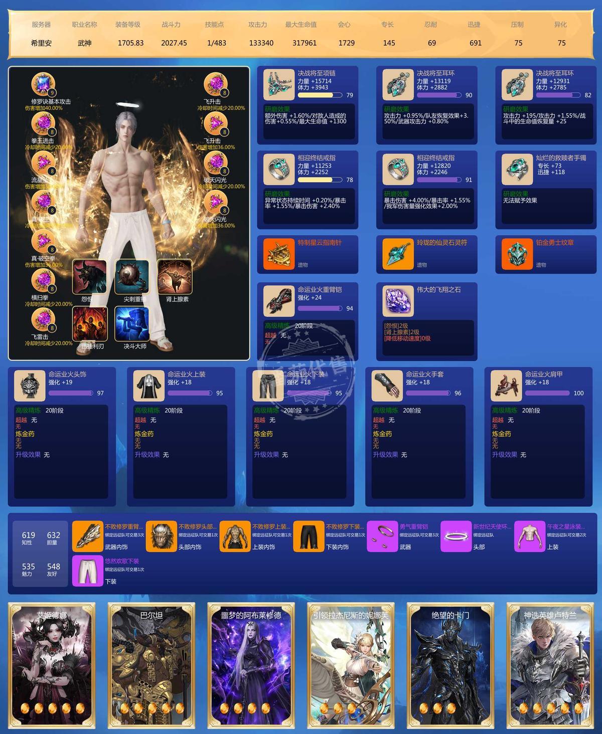 主号25枪术全身满品97石头.刀锋97 其他另外5个主玩号武器24 24 20 19 20 宝石2个9级,41个8级,22个7级 邮寄额度2400W 雷卡25 火卡25 土卡24 水卡22 辅助卡雷27 火26 土20 水27 3套天空,时装还行,不算多也不少。满技能点 ,号上还带100多W启动G 带宝石一起 边玩边卖 诚心要的可小刀 屠龙刀勿扰