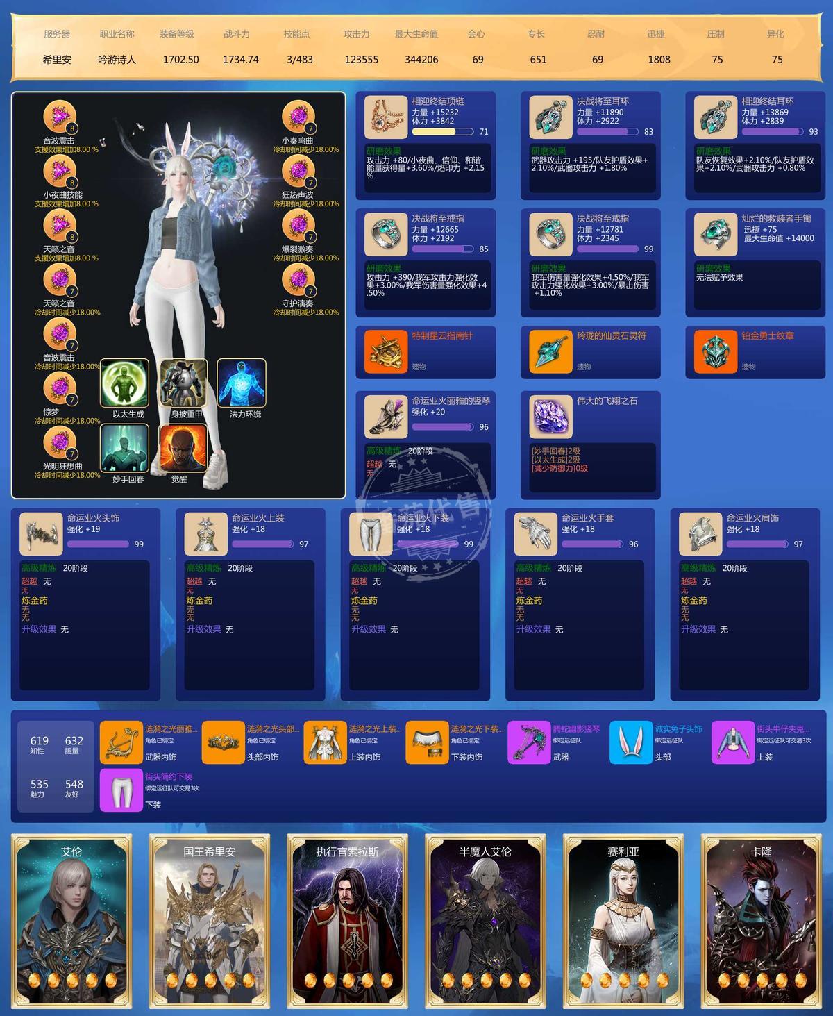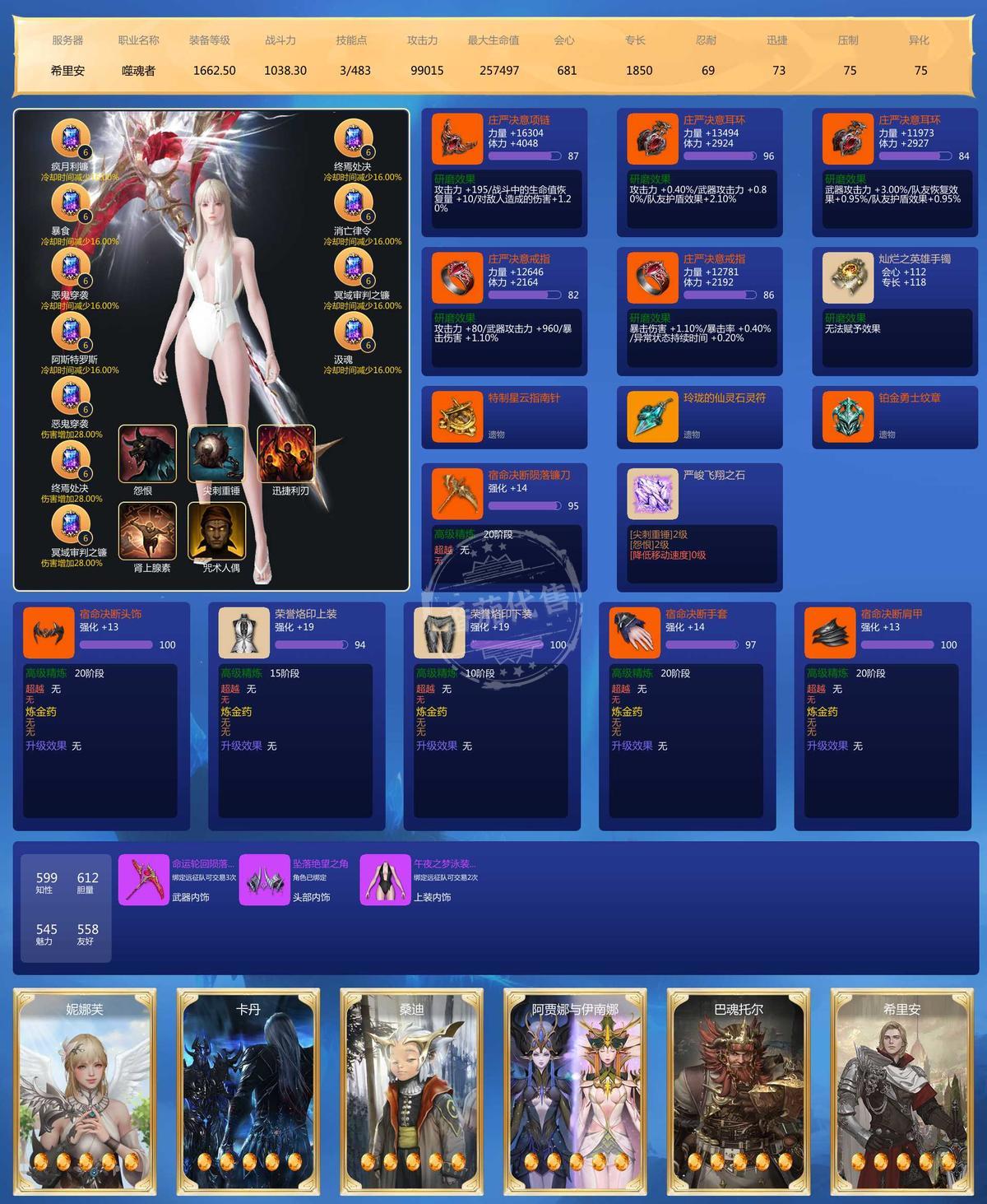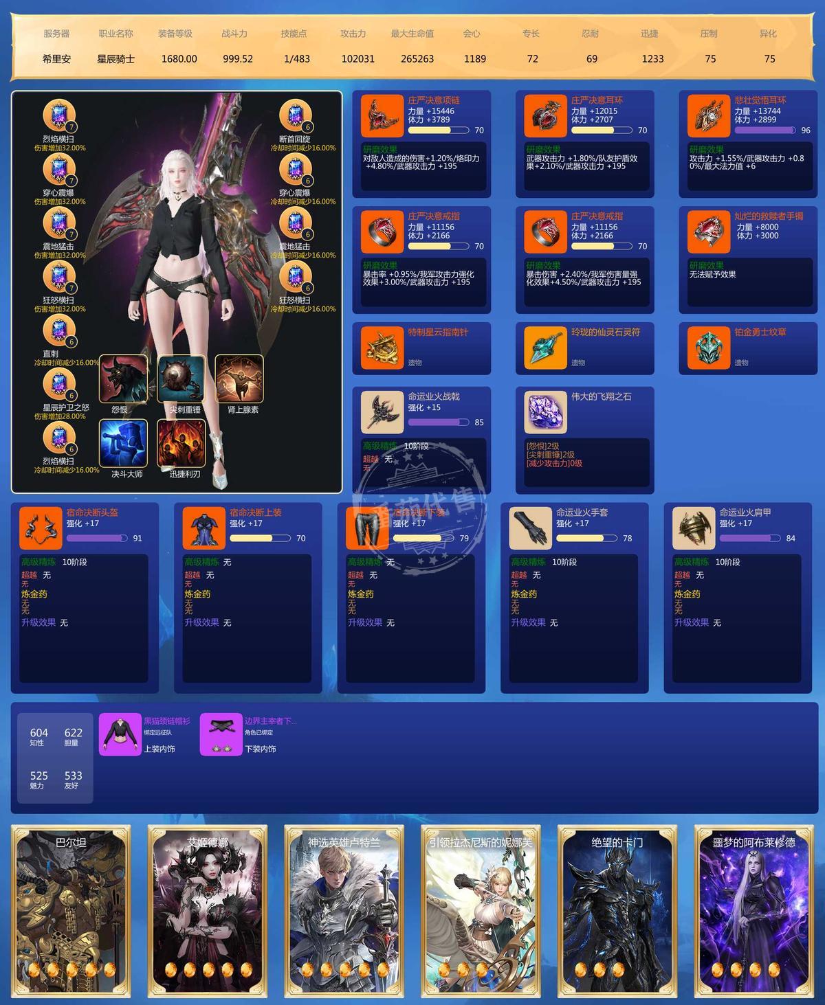 主号25枪术全身满品97石头.刀锋97 其他另外5个主玩号武器24 24 20 19 20 宝石2个9级,41个8级,22个7级 邮寄额度2400W 雷卡25 火卡25 土卡24 水卡22 辅助卡雷27 火26 土20 水27 3套天空,时装还行,不算多也不少。满技能点 ,号上还带100多W启动G 带宝石一起 边玩边卖 诚心要的可小刀 屠龙刀勿扰