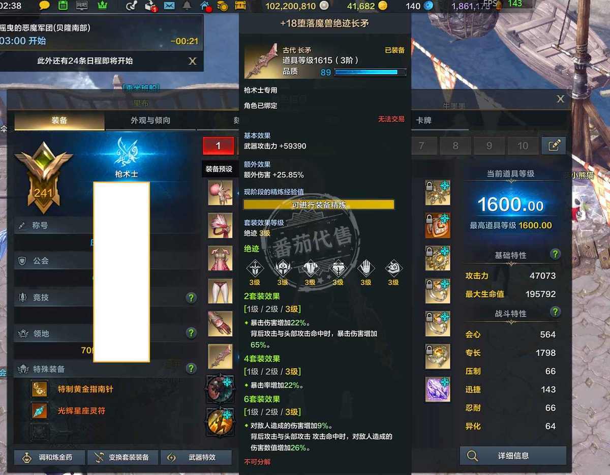 241远征,技能点全满收集基本全满,有三颗九级宝石20颗可交易七级宝石,枪术男拳全部40星,两个1600,一个1585,两个个1545小号提升的都是武器,两个1540,号上还有一亿银币、四万金币、140交易牌、两万七积分,一套kda积分套装,每个角色都有时装,上手可直接玩
