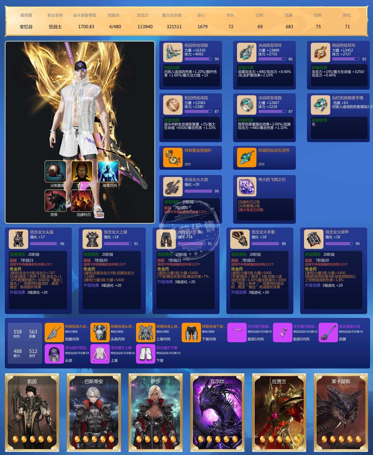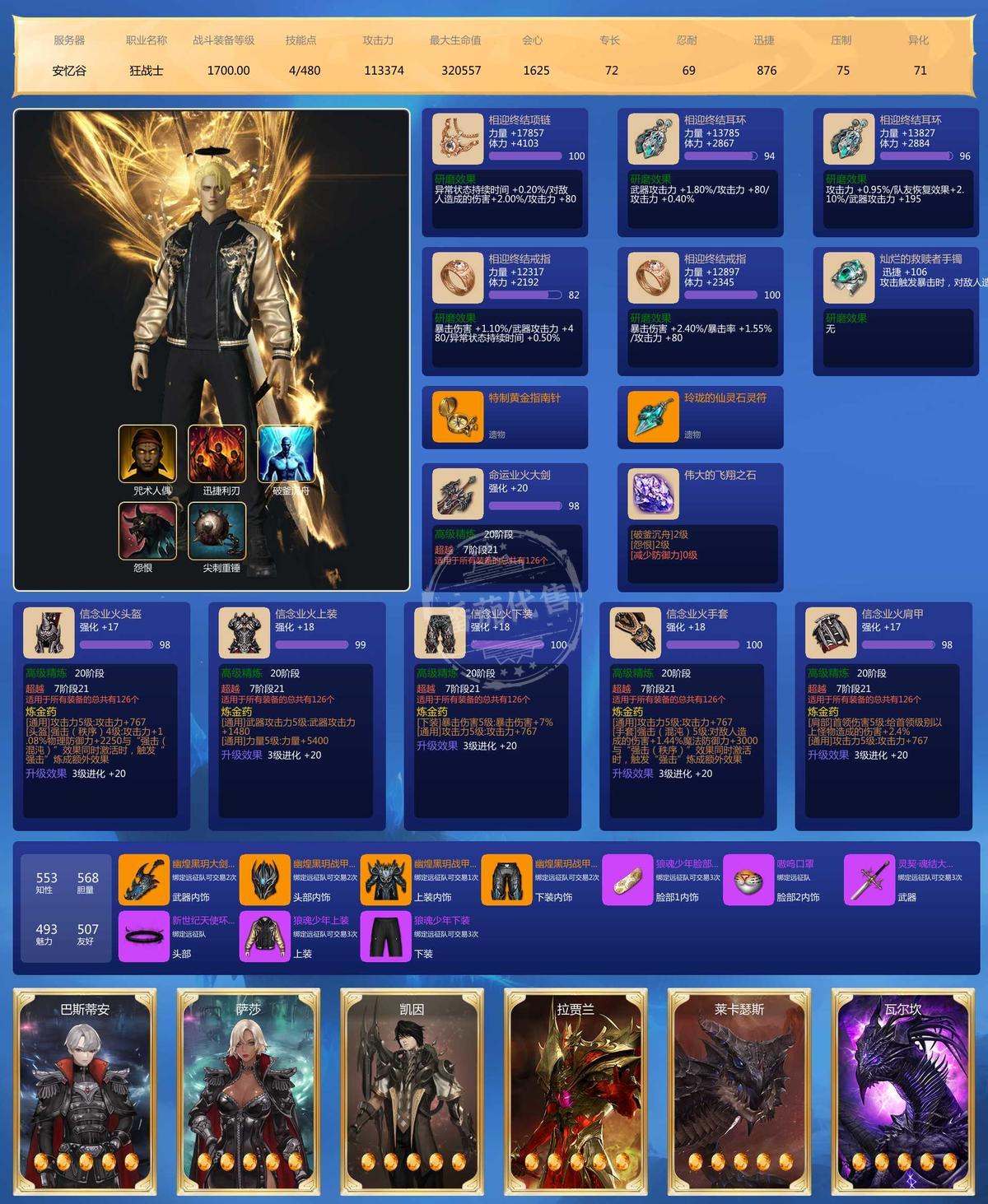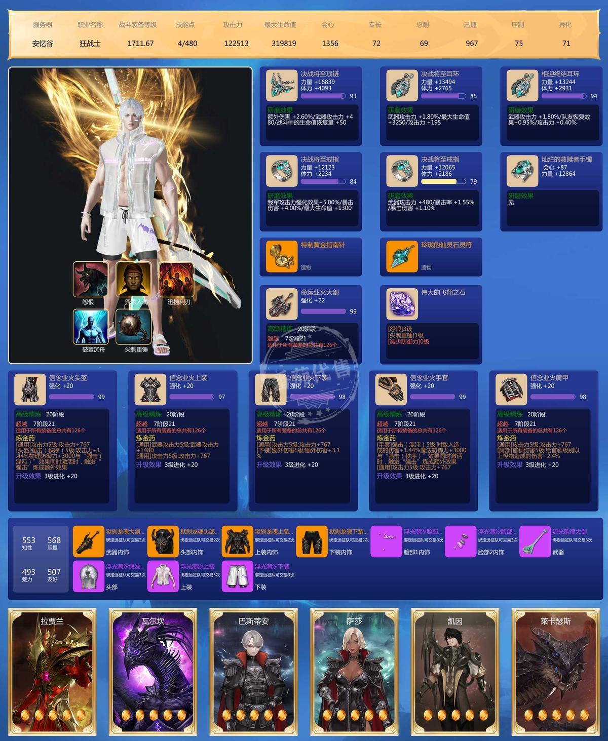 6连狂神,22武器1710加3连1700,加2连1690,带一身t4 8级宝石,外带60万金币,3套天空,还有价值500块钱的好看时装。打造很好