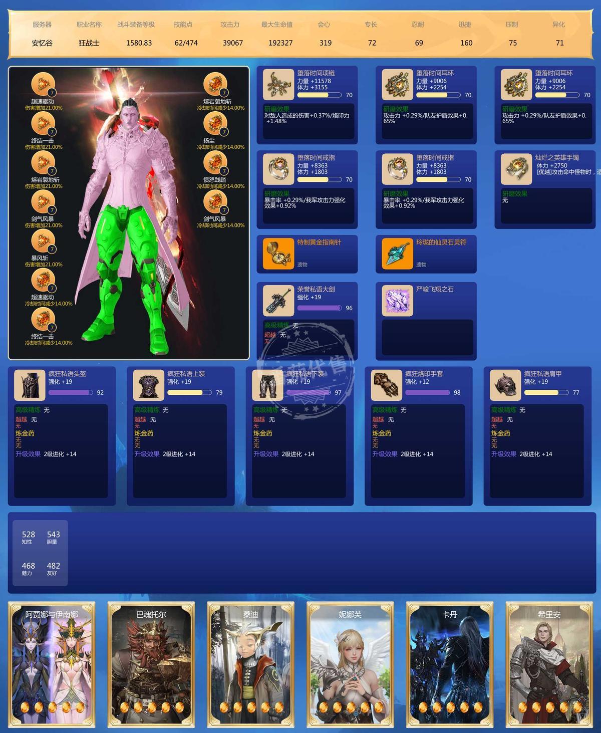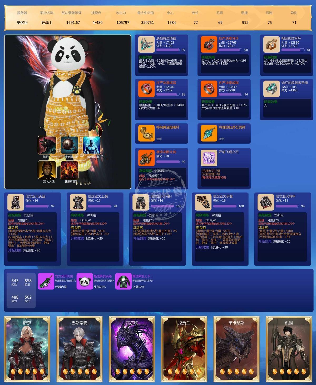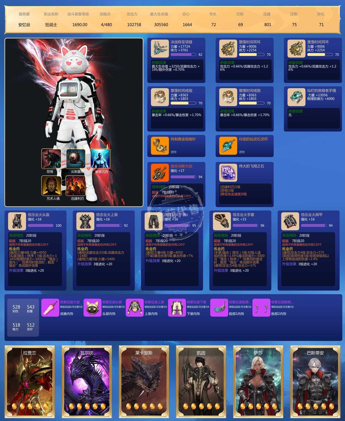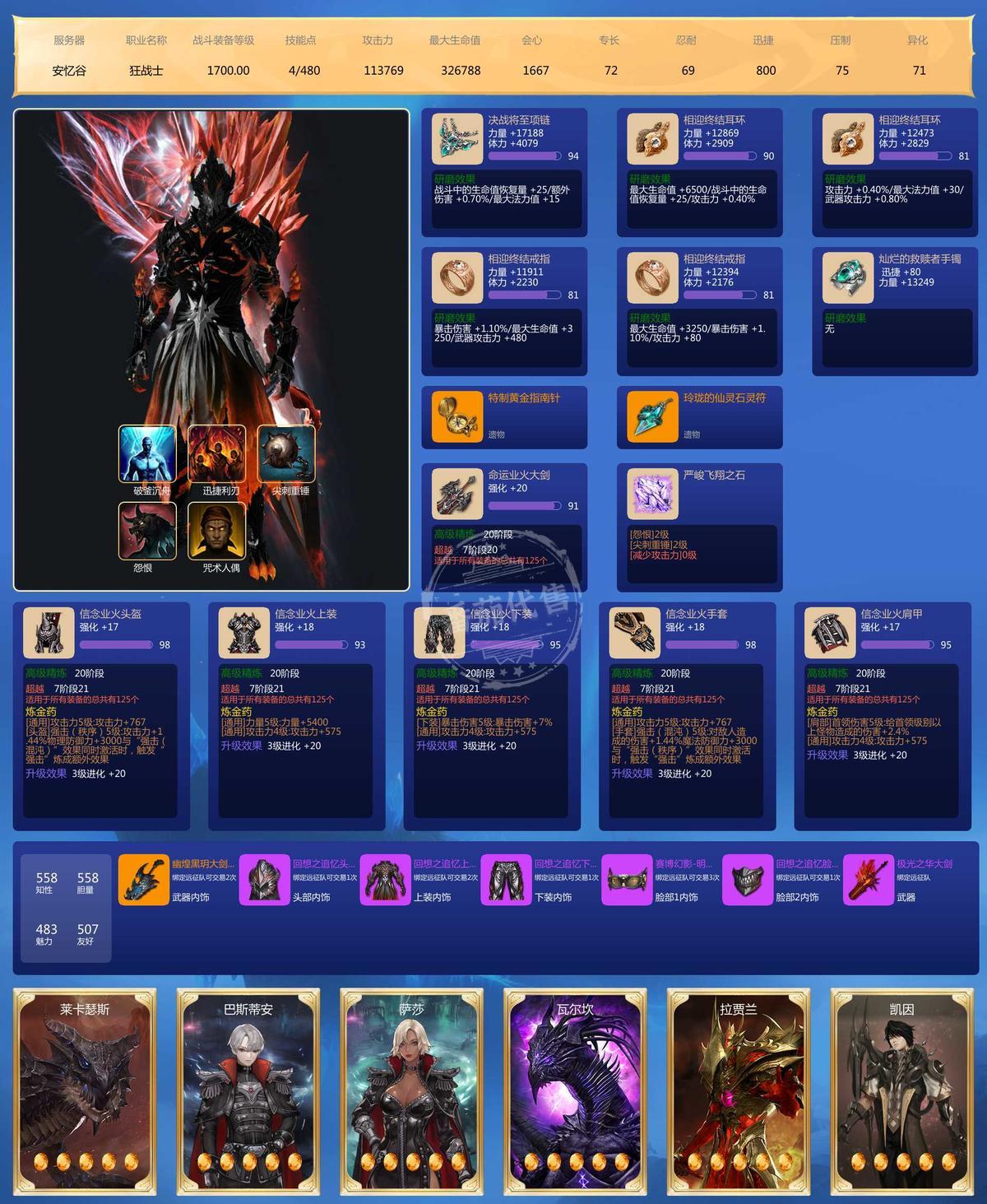 6连狂神,22武器1710加3连1700,加2连1690,带一身t4 8级宝石,外带60万金币,3套天空,还有价值500块钱的好看时装。打造很好