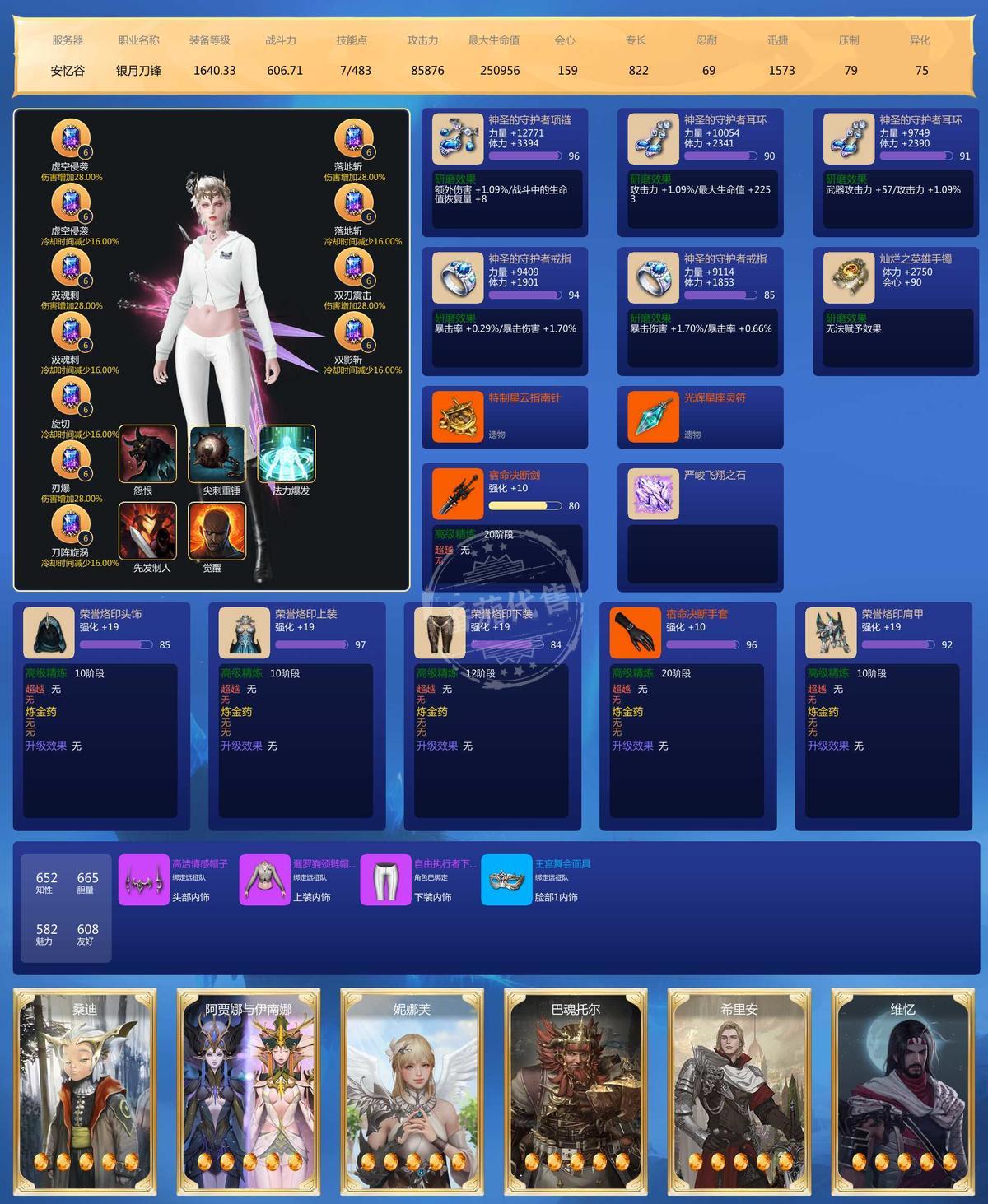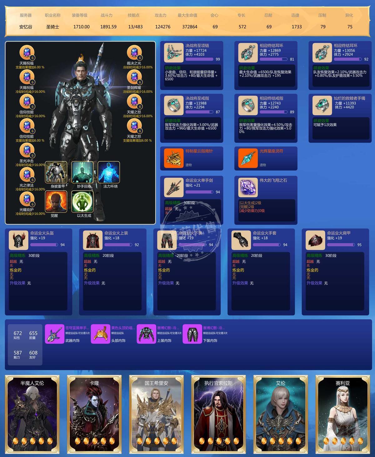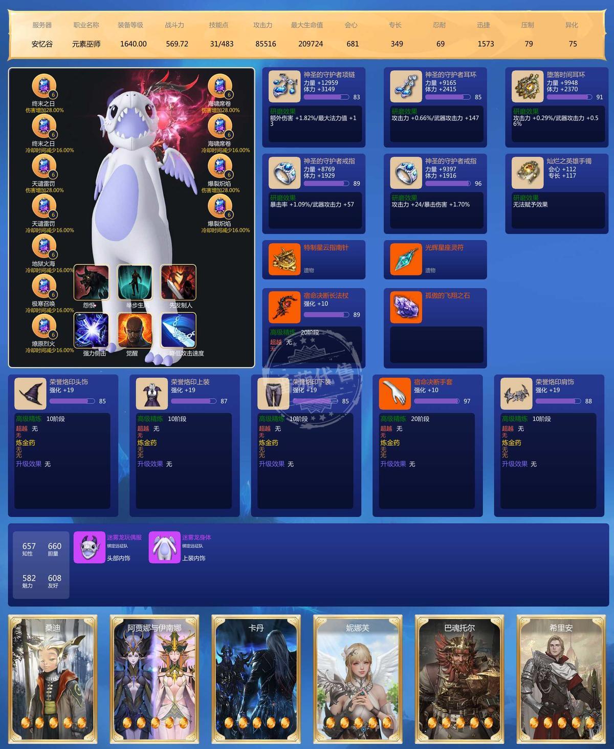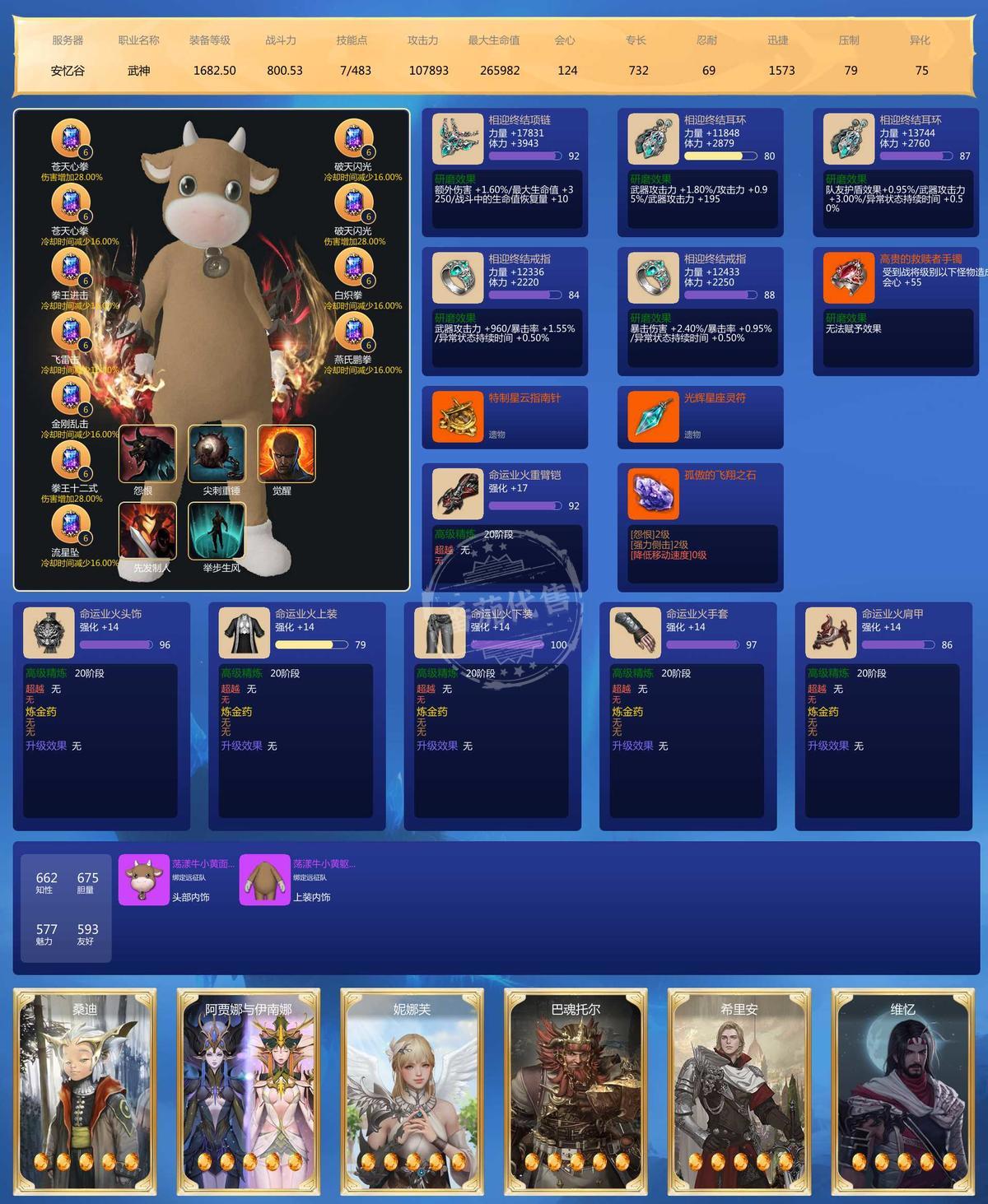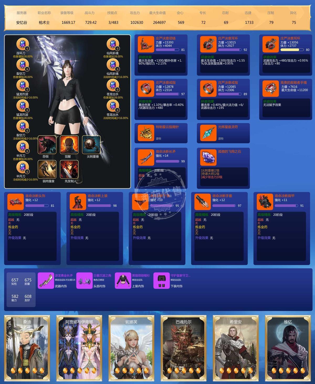 商品描述: 究极心血开服全勤号 354级远征 邮寄额度2400w 业力车头3个6 其他全部2个6 武器高阶三个40 三个30 点了很多防具的30 首饰全部单金以上 车头套六战斗力2100多 其他的号 一个1900三个1800一个1700多 遗物书吃了很多 怨恨两颗豆 咒术差两本满 所有卡片都在24以上 有几个快30的 背包有六七本自选卡牌 每个号红蓝石头10w以上 背包有800多箱精炼材料 乐园排名全部前30 收集摩乐乐种子 海图啥的全满 号上的阿特罗 血药 资源 游戏没了都用不完 生活方面 2500多跃动精华