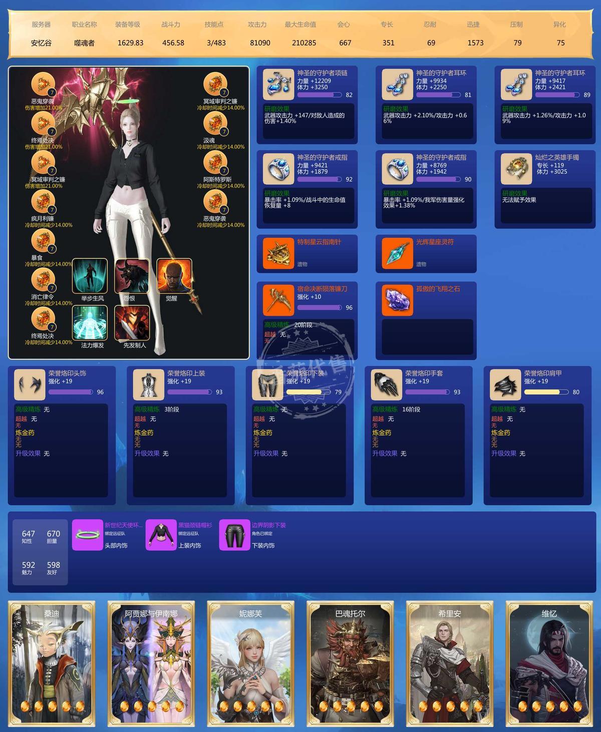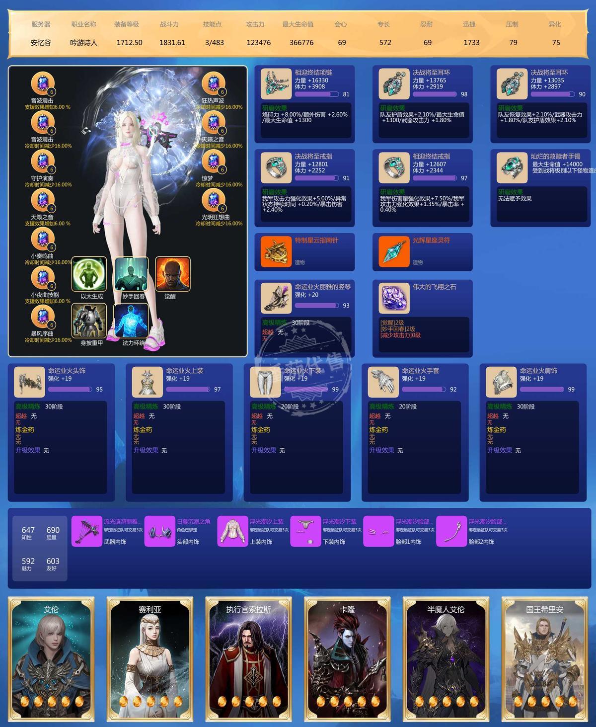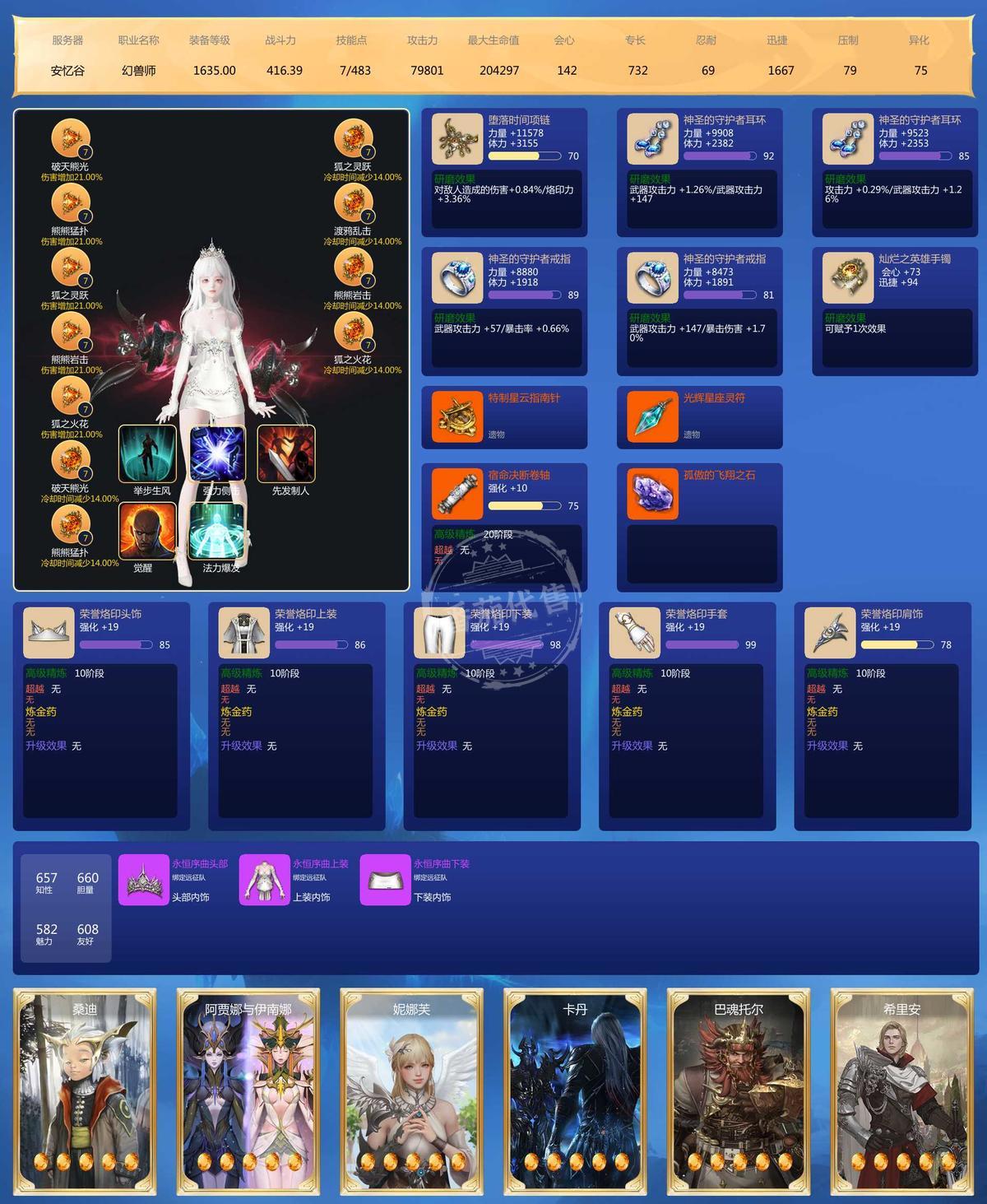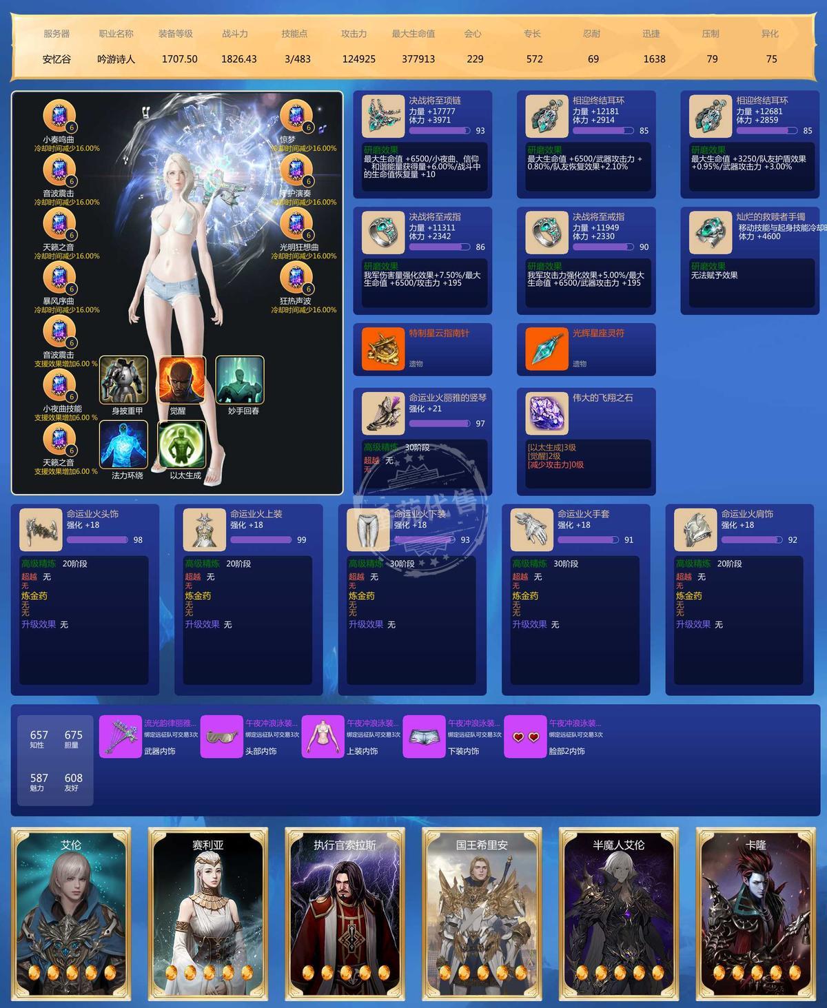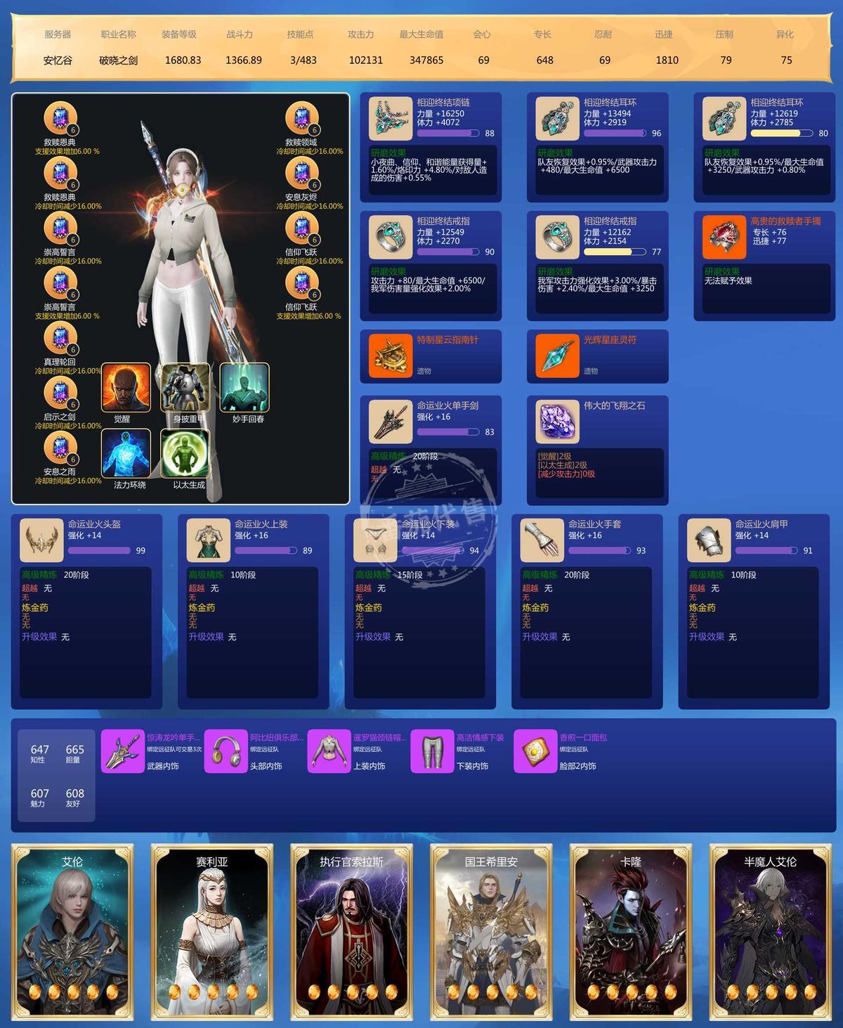 商品描述: 究极心血开服全勤号 354级远征 邮寄额度2400w 业力车头3个6 其他全部2个6 武器高阶三个40 三个30 点了很多防具的30 首饰全部单金以上 车头套六战斗力2100多 其他的号 一个1900三个1800一个1700多 遗物书吃了很多 怨恨两颗豆 咒术差两本满 所有卡片都在24以上 有几个快30的 背包有六七本自选卡牌 每个号红蓝石头10w以上 背包有800多箱精炼材料 乐园排名全部前30 收集摩乐乐种子 海图啥的全满 号上的阿特罗 血药 资源 游戏没了都用不完 生活方面 2500多跃动精华